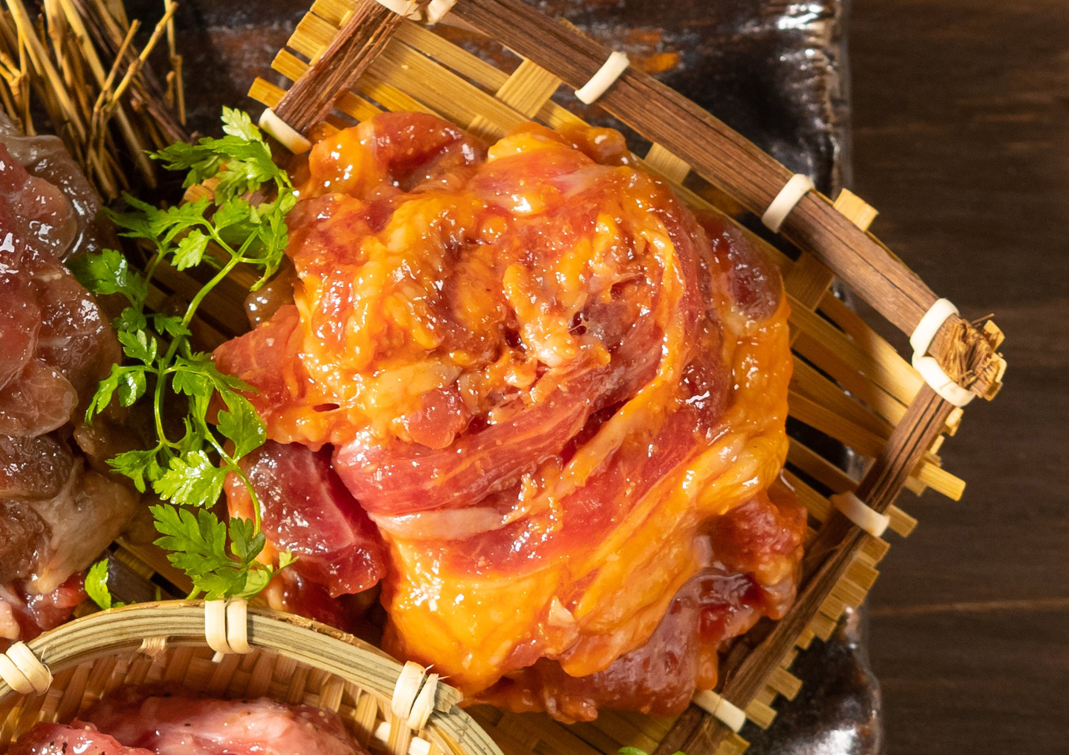 みそベースのタレに漬け込んだ味付ラム。お好みの野菜と一緒にどうぞ。