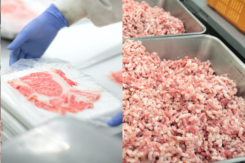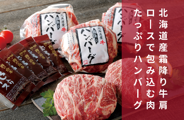 適度な脂身と、しつこさの残らない上質な旨味を持つ北海道産牛ハンバーグに、更に程よく霜ののった北海道産霜降り牛肩ロースで包み込むことにより、牛肉本来の歯ごたえと、ジューシーな旨味をぎっしりと詰め込み、肉汁がジュワ~っと出る絶品ハンバーグを作ることができました。